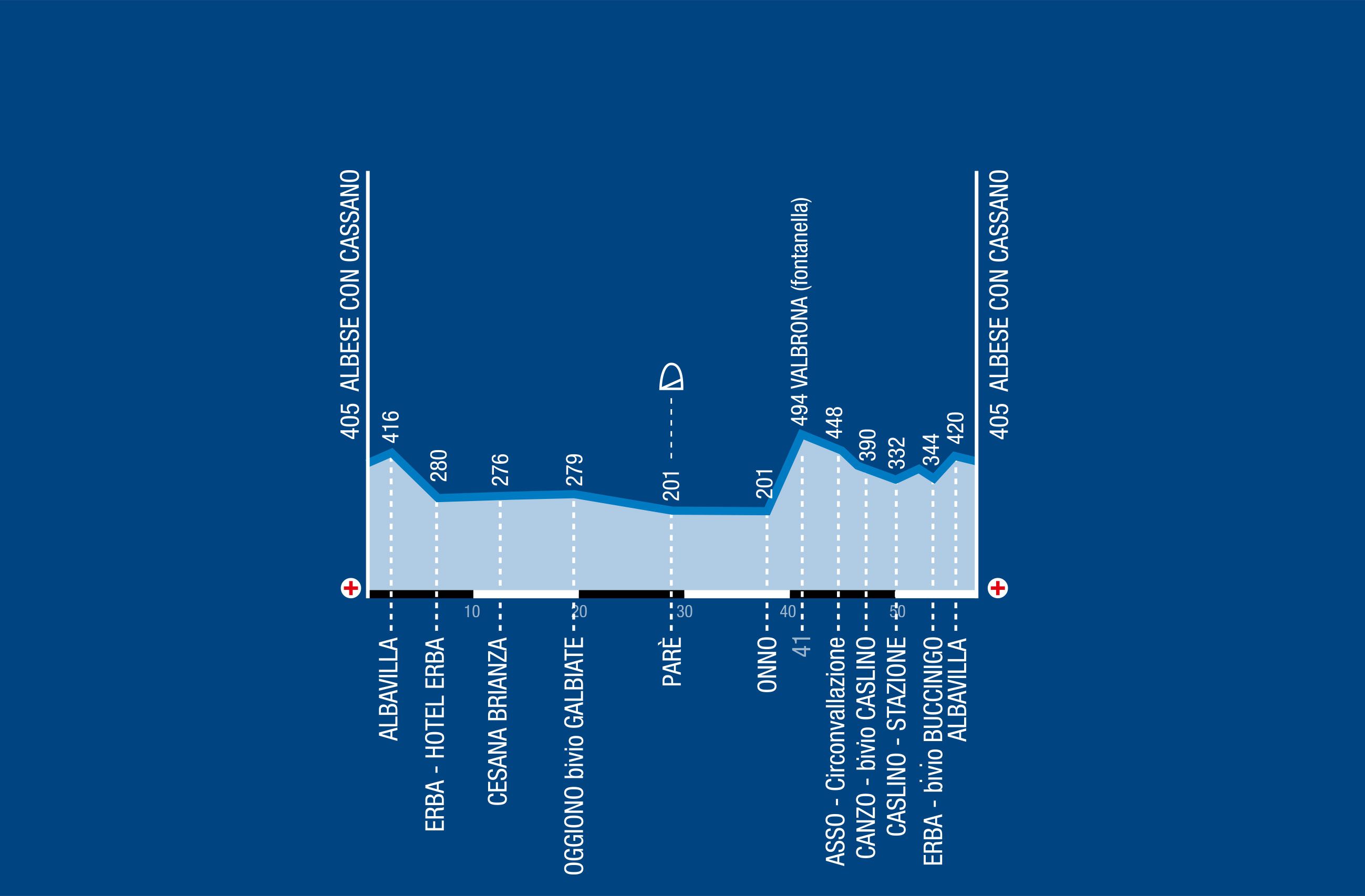 Al termine della salita alla rotonda si prosegue su via Brianza (3^ uscita) e si scende verso Albese con percorso in falsopiano in discesa. All’ingresso del paese attenzione alla doppia curva sinistra destra oltre la quale, circa 150 metri, si svolta a sinistra in Via Colombo, poi a destra in via Don Sturzo e dopo 58 km si è all’arrivo.