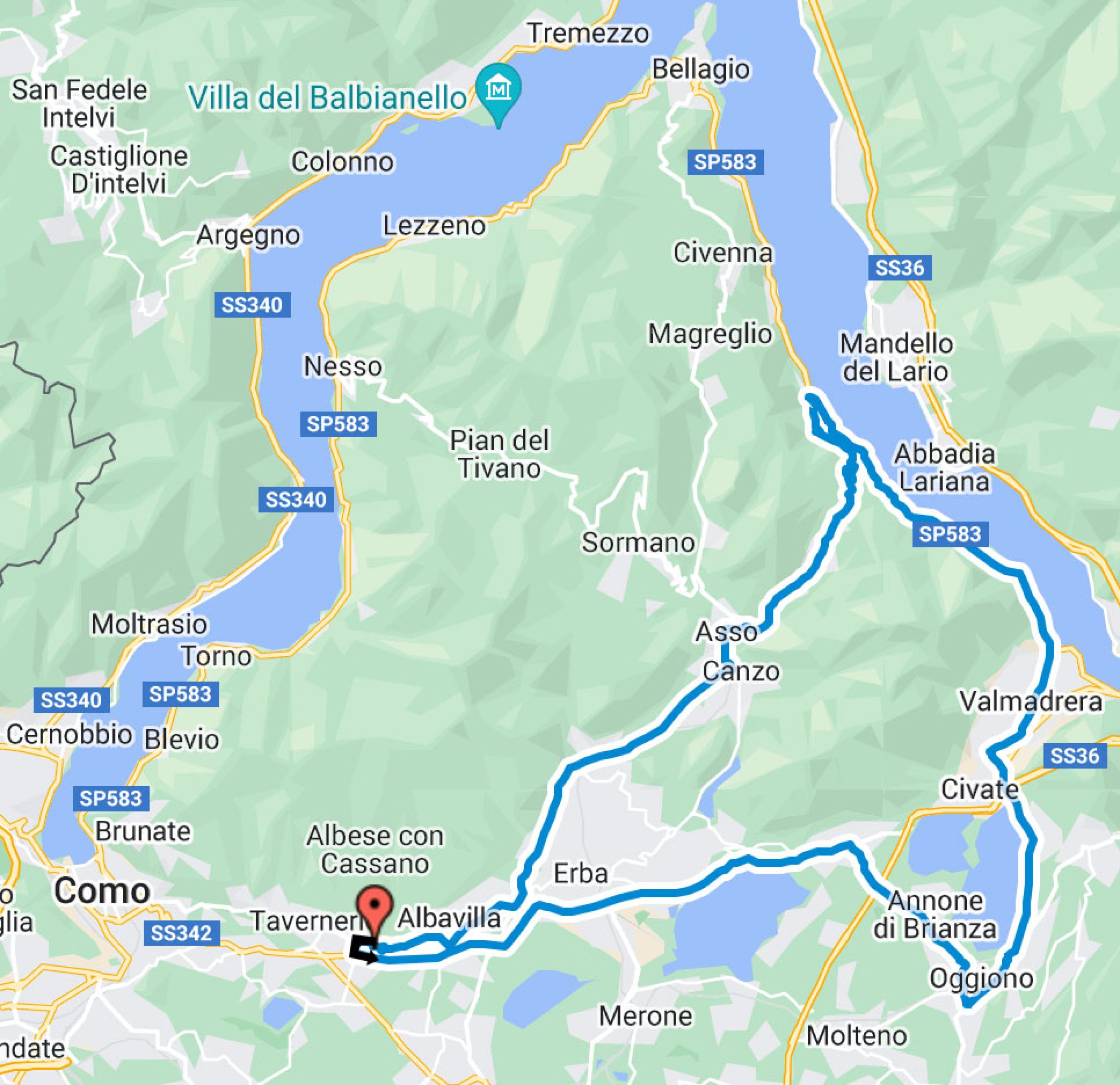 Partenza da Albese con Cassano via Don Sturzo, ci si immette sulla via Roma, quindi via Montorfano alla rotonda a sinistra per inserirsi sulla SP 639 Viale Lombardia in direzione Erba che si raggiunge dopo una discesa di circa 3 km, da Erba si prosegue sulla SP 639 e con percorso pianeggiante si costeggia il lago di Pusiano con splendida vista sull’isola dei Cipressi.