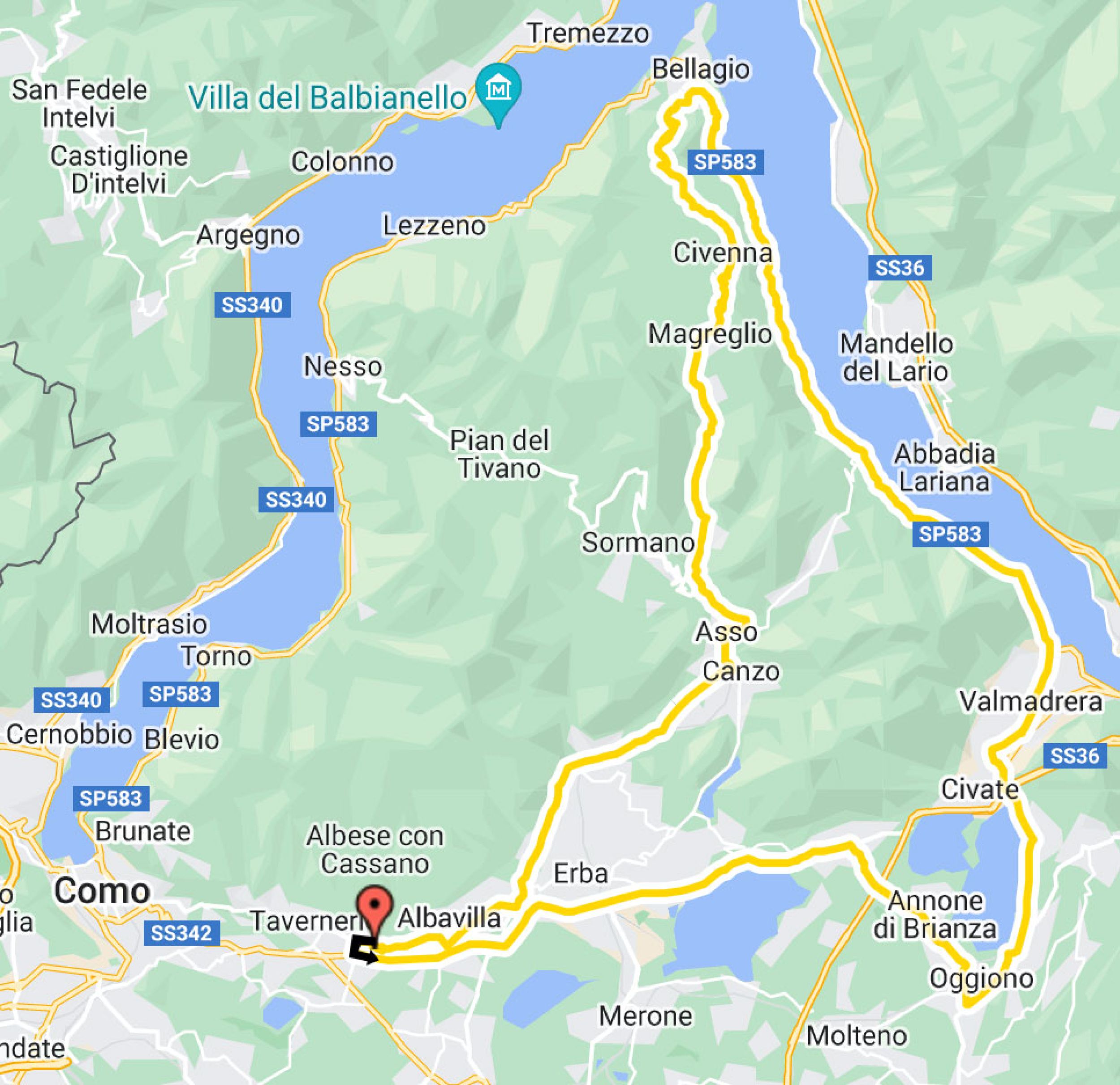 Partenza da Albese con Cassano via Don Sturzo, ci si immette sulla via Roma, quindi via Montorfano alla rotonda a sinistra per inserirsi sulla SP 639 Viale Lombardia in direzione Erba che si raggiunge dopo una discesa di circa 3 km, da Erba si prosegue sulla SP 639 e con percorso pianeggiante si costeggia il lago di Pusiano con splendida vista sull’isola dei Cipressi.