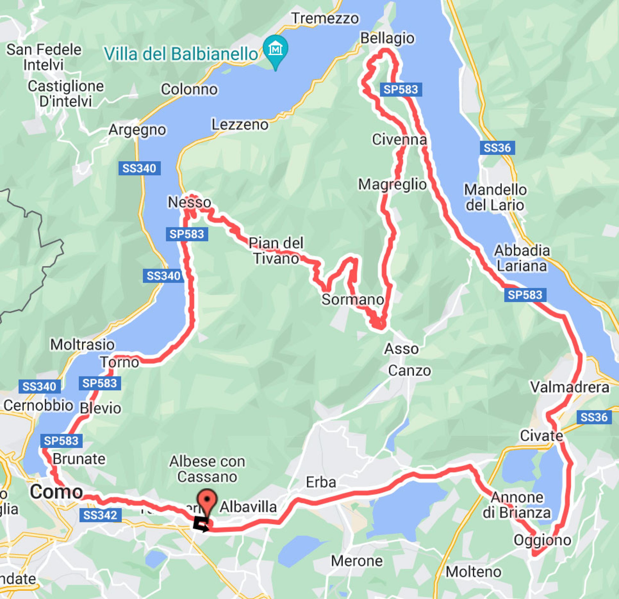 Partenza da Albese con Cassano via Don Sturzo, ci si immette sulla via Roma, quindi via Montorfano alla rotonda a sinistra per inserirsi sulla SP 639 Viale Lombardia in direzione Erba che si raggiunge dopo una discesa di circa 3 km, da Erba si prosegue sulla SP 639 e con percorso pianeggiante si costeggia il lago di Pusiano con splendida vista sull’isola dei Cipressi. Attraversato il paese di Pusiano e di Cesana Brianza, si giunge a Suello, dove alla rotonda si abbandona la SP 639 svoltando a destra sulla SP 49 in direzione di Oggiono, si supera su cavalcavia la superstrada SS36 proseguendo in direzione di Oggiono. In Oggiono alla rotonda dell’incrocio con la SP 51, si svolta a sinistra proseguendo in direzione Lecco. Si scende in discesa con vista sul lago di Annone, si sottopassa la SS 46 in direzione di Civate, si sovrappassa la vecchia superstrada per Lecco in via Giovanni XXIII, si svolta a destra per Valmadrera in via Santa Vecchia, via 25 Aprile, viale Promessi Sposi fino alla rotonda della SP583 con svolta a sinistra in direzione Bellagio.